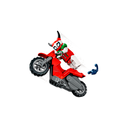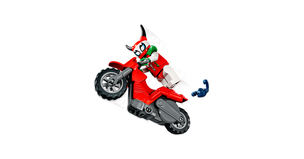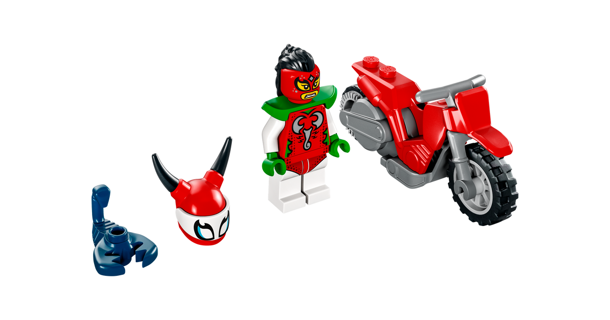 Pane laste mängud elama LEGO® City hulljulge skorpioni trikimootorratta (60332) mängukomplektiga, milles on lahe hooratta jõul töötav trikimootorratas ja LEGO City Stuntz tegelaskuju Skorpion Luchadora, kellega käib kaasas tema lemmikloomast skorpioni figuur – nad on pilkupüüdvate trikietenduste korraldamisel ideaalne paar.