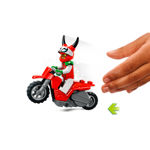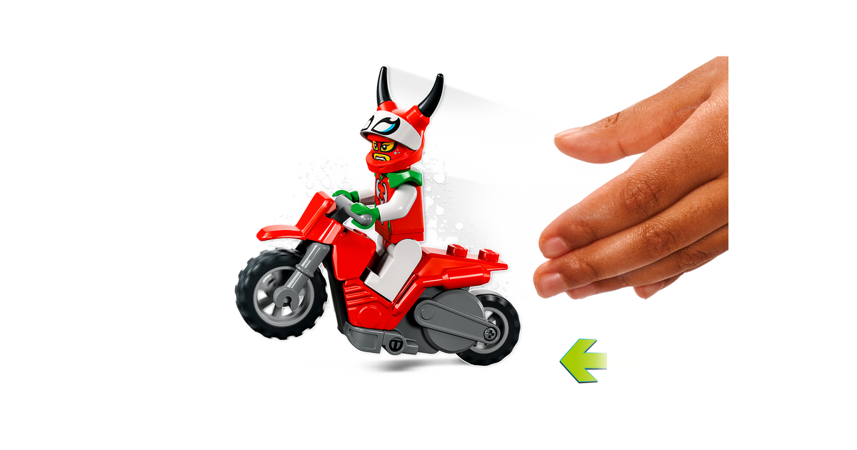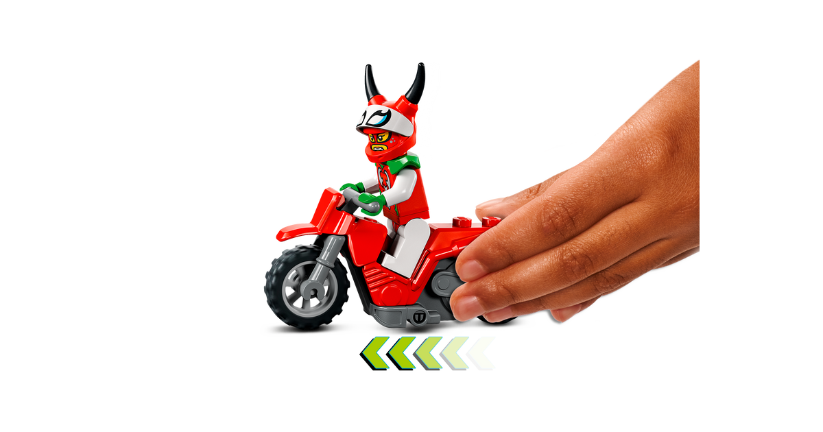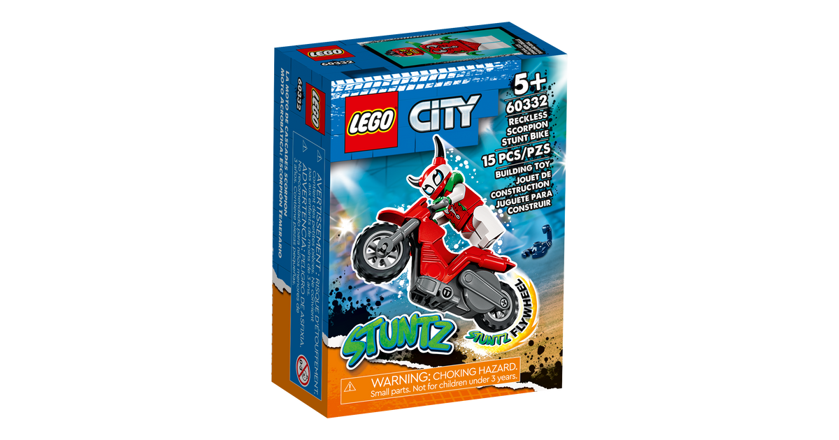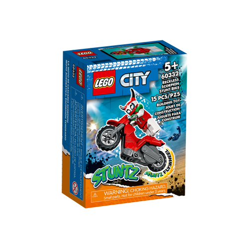- Lükatav mängutrikiratas – anna seiklustele hoogu selle LEGO® City hulljulge skorpioni trikimootorratta (60332) mängukomplektiga, mida täiendab LEGO City Stuntz võidusõitja minifiguur
