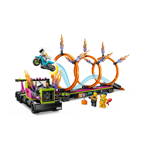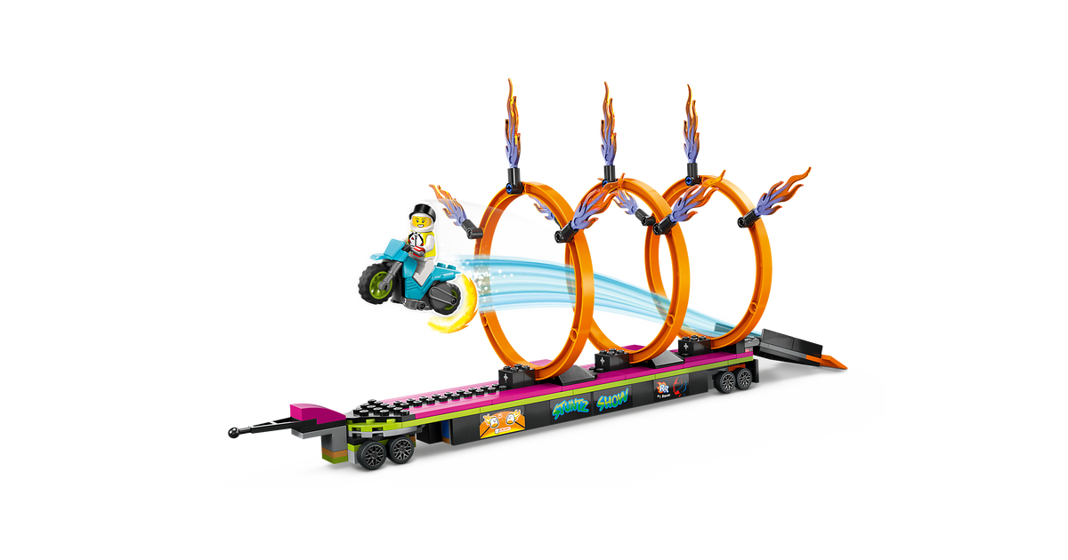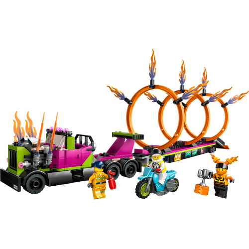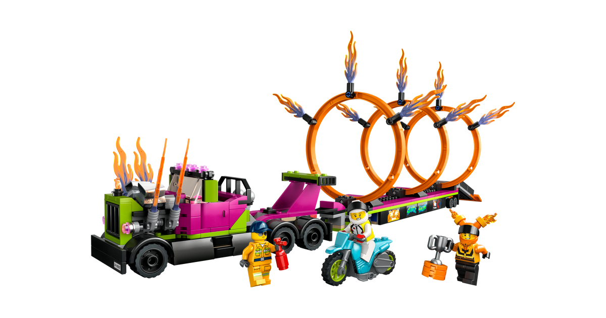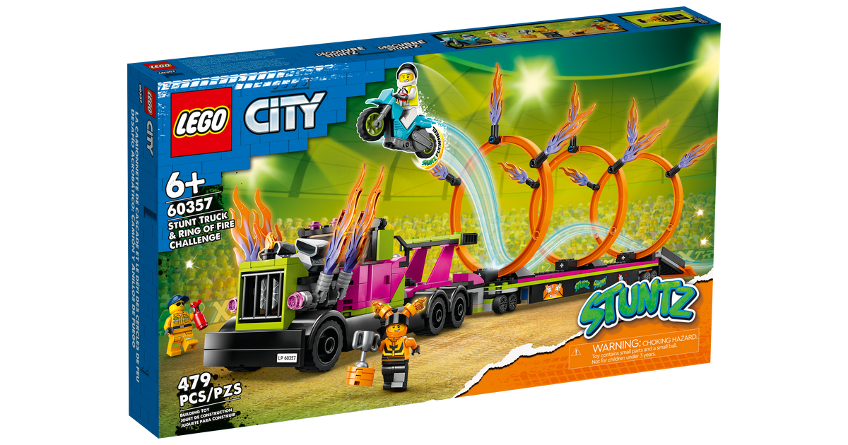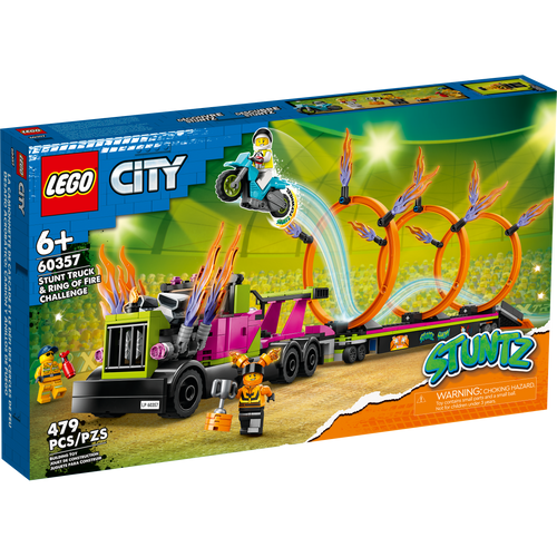 Too etendus linna komplektiga LEGO® City Trikiveoki ja tulerõnga väljakutse (60357). See alates 6-aastastele mõeldud aktiivne mängukomplekt sisaldab lahedat veokit koos tuld purskavate väljalasketorudega ja tasapinnalist haagist koos allapandava stardirambi ja kolme kohandatava tulerõngaga. Tundide pikkuseks seiklusterohkeks mänguks lisa lihtsalt hooratta jõul liikuv trikimootorratas, veokijuht ja kaks Stuntzi sõitja minifiguuri.