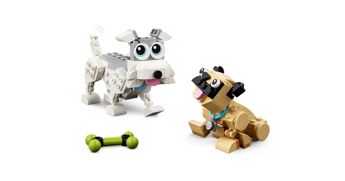 Selles suurepärases LEGO Creator 3in1 mängukomplektis leiduva kolme koeraga ei saa koeramäng kunagi otsa. Lapsed saavad kokku panna Beagle’i, puudli ja labradori, ehitata need ümber minisnautseriks ja mopsiks või muuta hoopis Huskyks ja pikakarvaliseks taksiks.