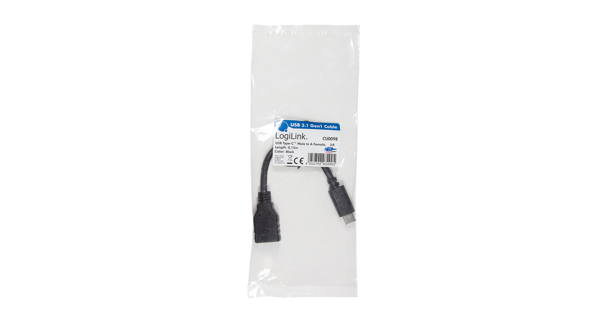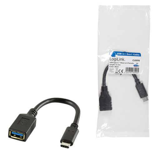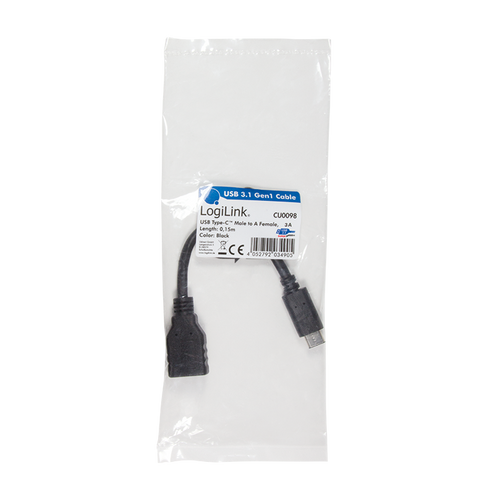 LogiLink USB C - USB A 0.15m, 0,15 m, USB C, USB A, USB 3.2 Gen 2 (3.1 Gen 2), Meessoost/naissoost, Must