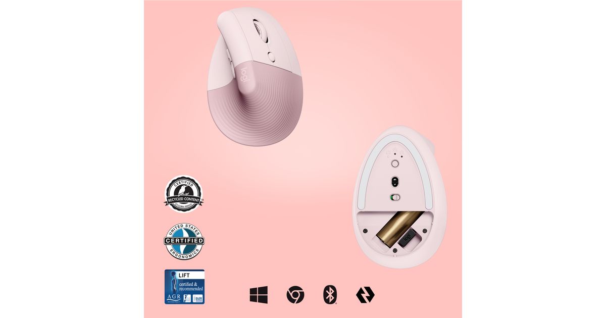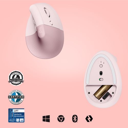 Logitech Lift, Parempoolne, Vertikaalne, Optiline, RF juhtmeta ühendus + Bluetooth, 4000 DPI, Roosa