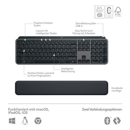 Logitech MX Keys S Combo, RF juhtmeta ühendus + Bluetooth, Käärlüliti, QWERTZ, LED, Grafiit, Hiir kaasa arvatud