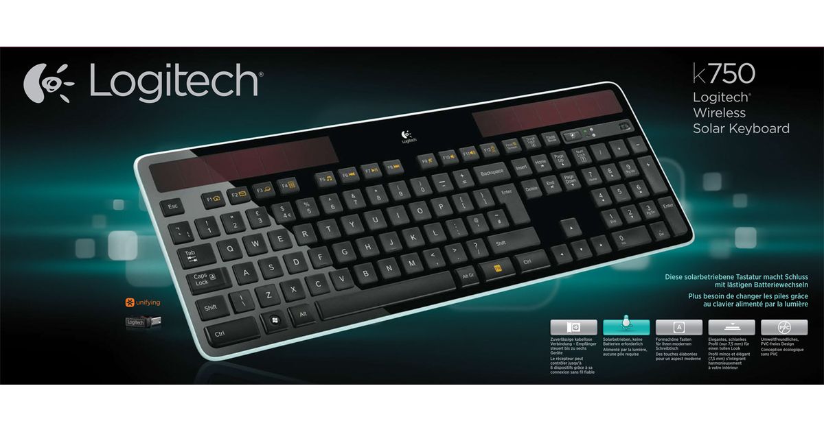 Logitech Wireless Solar Keyboard K750, Full-size (100%), Juhtmevaba, Raadioside, QWERTZ, Must
