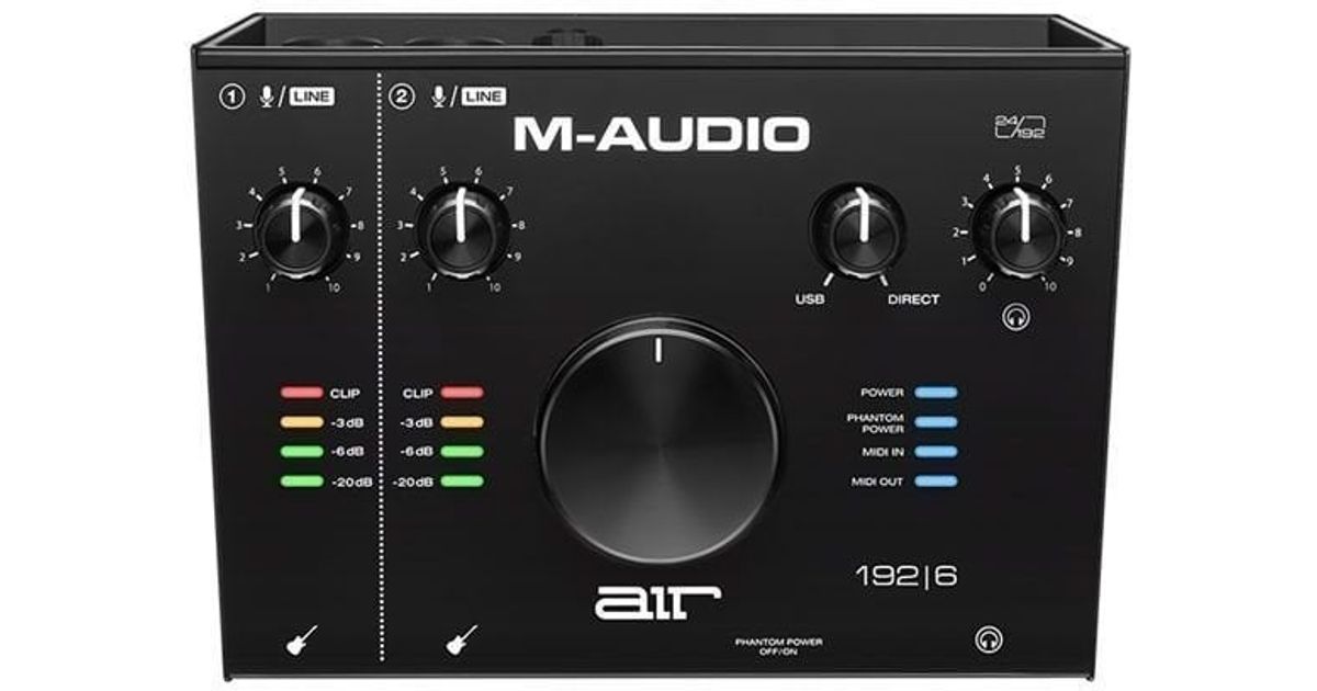 USB audio interface - 2 In/2 Out - from M-Audio. With the AIR 192/6, you can create 24-bit/192kHz studio-quality recordings with an intuitive and easy-to-use audio interface. The AIR 192/6 enables you to record up to 2 channels at once with its 2 dedicated XLR + 6,3 mm jack balanced combo inputs, and 2 all-new 6,3 mm jack instrument inputs that have a specially designed gain and impedance stage to provide the most accurate representation of a guitar or bass plugged directly into the interface. 5-pin MIDI In and Out connections are included for connecting synths, sequencers and other external MIDI gear.