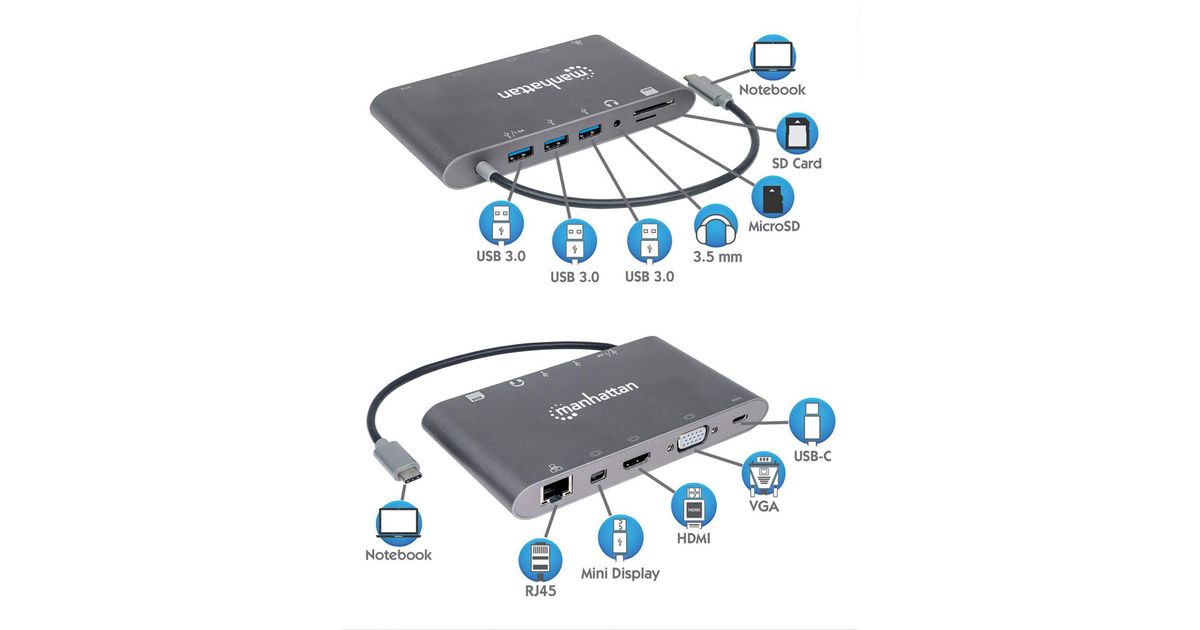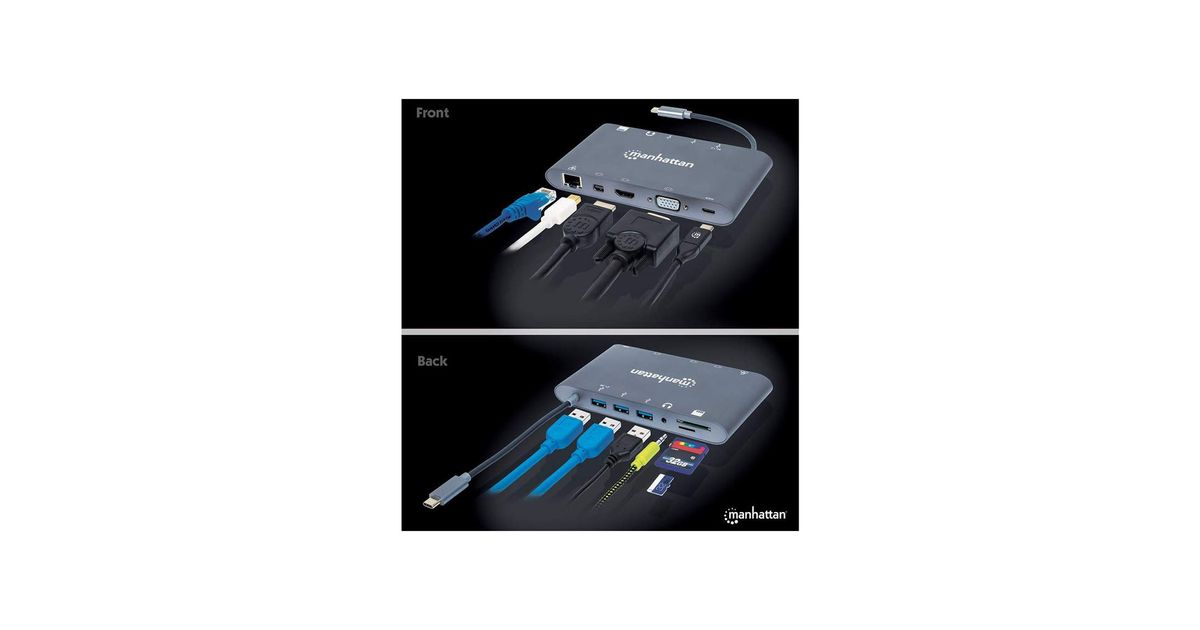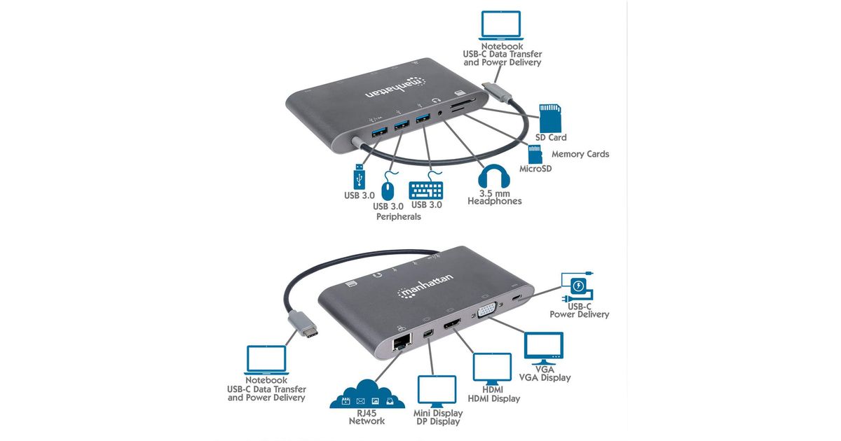 Manhattan USB-C 3.1 multiport adapter -> HDMI/MiniDP/VGA/3x USB-A/USB-C PD/RJ45 - Dokkimisjaamad - Muud tooted - Telefonid ja tahvelarvutid - Audio-video - MT Shop