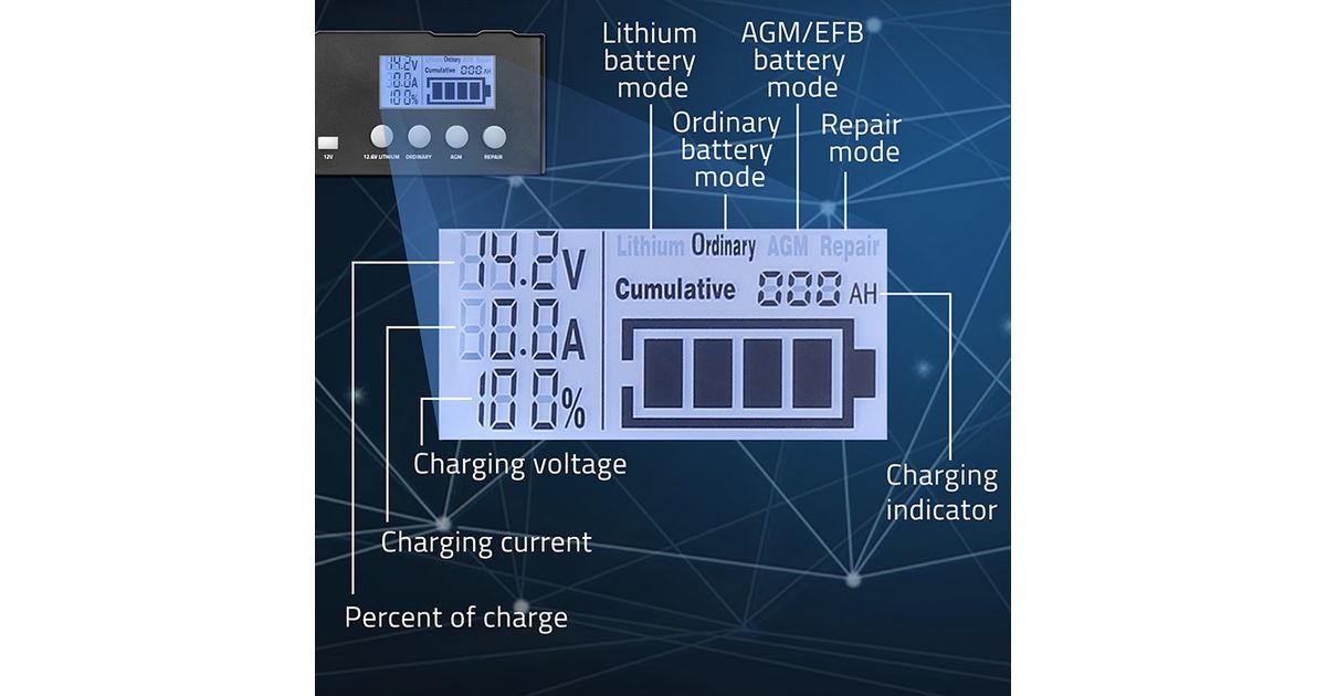 The charger uses an intelligent 4-stage charging process that adjusts the voltage and current based on the battery's current charge state, ensuring optimal performance and care for the battery at each stage. It consists of four stages: