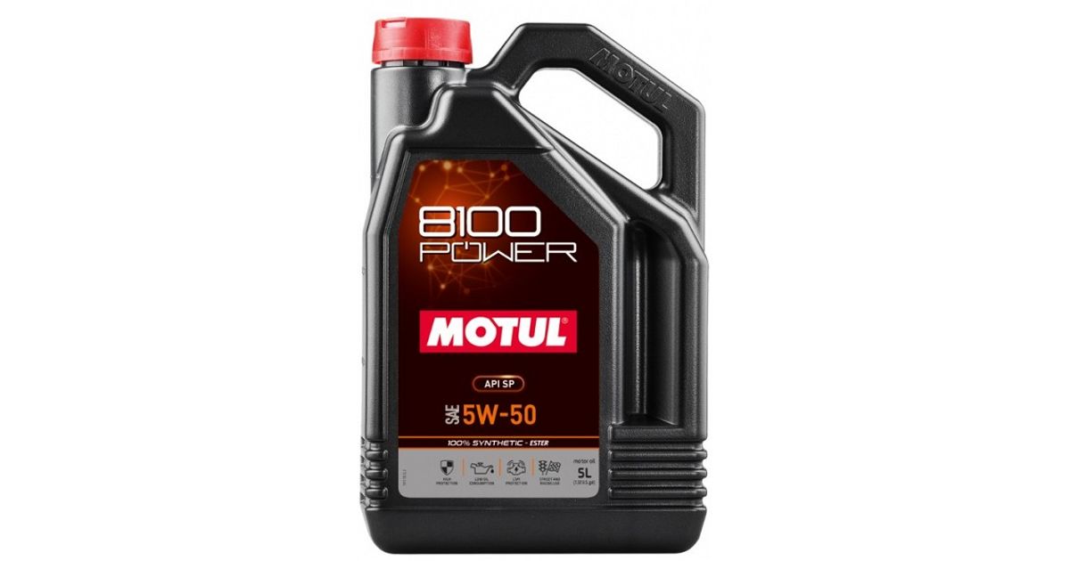 100% sünteetiline – konkurentsist inspireeritud ESTER baasil mootoriõli. mis on spetsiaalselt loodud bensiini- või diiselmootoritele suure jõudlusega. vabalthingava või turbo ülelaaduriga. sissepritsega mootoritele. mis töötavad laias pöörete ja temperatuurivahemikus ning kõige raskemates tee- või võidusõidutingimustes. Sobib bensiini- ja diiselmootoritele. mis nõuavad API SP viskoossusklassi 5W-50 mootoriõli. MOTUL 8100 POWER 5W-50 eksklusiivne valem sobib kasutada biokütusega (eriti Etanool E85) ja enamus heitgaaside järeltöötlussüsteemidega. Samuti kaitseb see väiksema suurusega mootoreid LSPI (Low Speed Pre-Ignition) riski eest ning selle optimeeritud kõrge viskoossusaste tagab teie mootori maksimaalse töökindluse ja kõrge kaitse kütuse mootoriõlisse sattumise eest. Väga hea ühilduvus katalüüsmuunduritega. Sobib igat tüüpi plii- või pliivaba bensiini. etanooli. vedelgaasi. diisel- ja biokütuste jaoks. Enne kasutamist lugege alati sõiduki manuaali. et veenduda õli sobivuses.