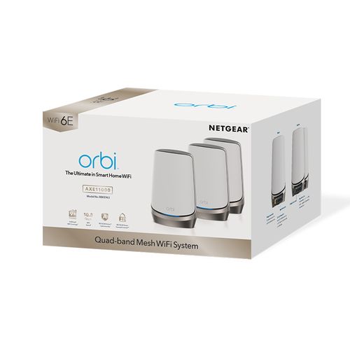 NETGEAR Orbi Quad-band RBKE963 AXE11000 WiFi 6E Mesh System, Hall, Valge, Sisemodem, Võimsus, Wi-Fi 6 (802.11ax), 802.11a, 802.11b, 802.11g, Wi-Fi 4 (802.11n), Wi-Fi 5 (802.11ac), Wi-Fi 6 (802.11ax), Wi-Fi 6E..., 1200 Mbit/s