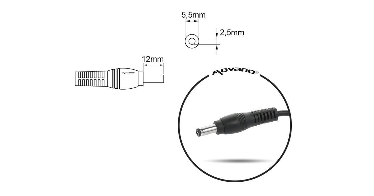 | Power plug | Średnica zewnętrzna 5.5 mm, średnica wewnętrzna 2.5 mm, długość 12 mm |
