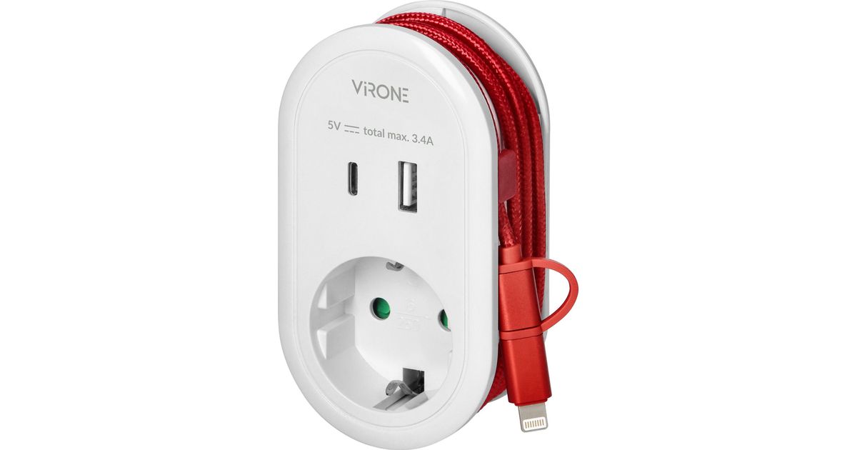 Orno USB adapter Adapter USB laadija ja laadimiskaabliga (tüüp C + Lightning), 1x2P+Z Schuko, 2xUSB (tüüp A+C), max 3,4A