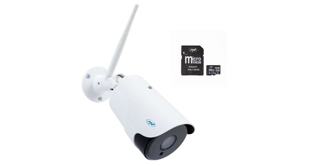 Pakett PNI House IP52LR 2MP 1080P juhtmevaba IP videovalve kaamera + PNI 128GB MicroSD mälukaart SD adapteriga