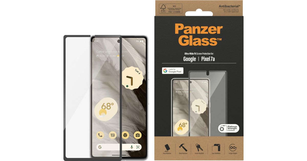 PanzerGlass Displayschutz Ultra Wide Fit, Google, Google - Pixel 7a, Kuiv pealekandmine, Kriimukindel, Löögikindel, Antibakteriaalne, Läbipaistev, 1 tk
