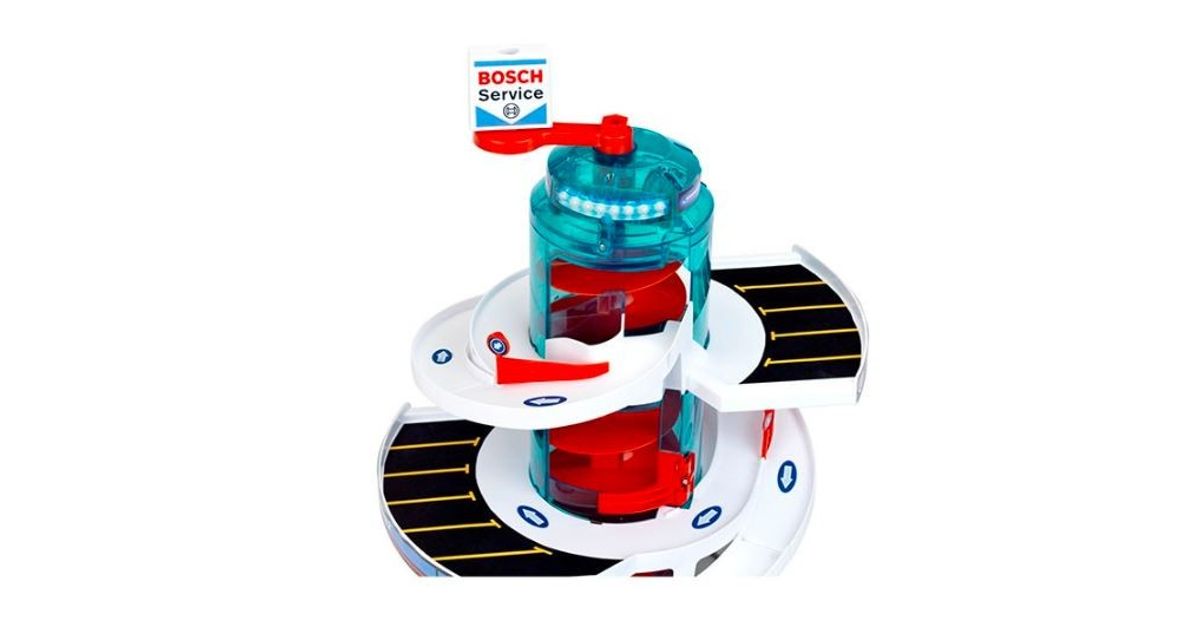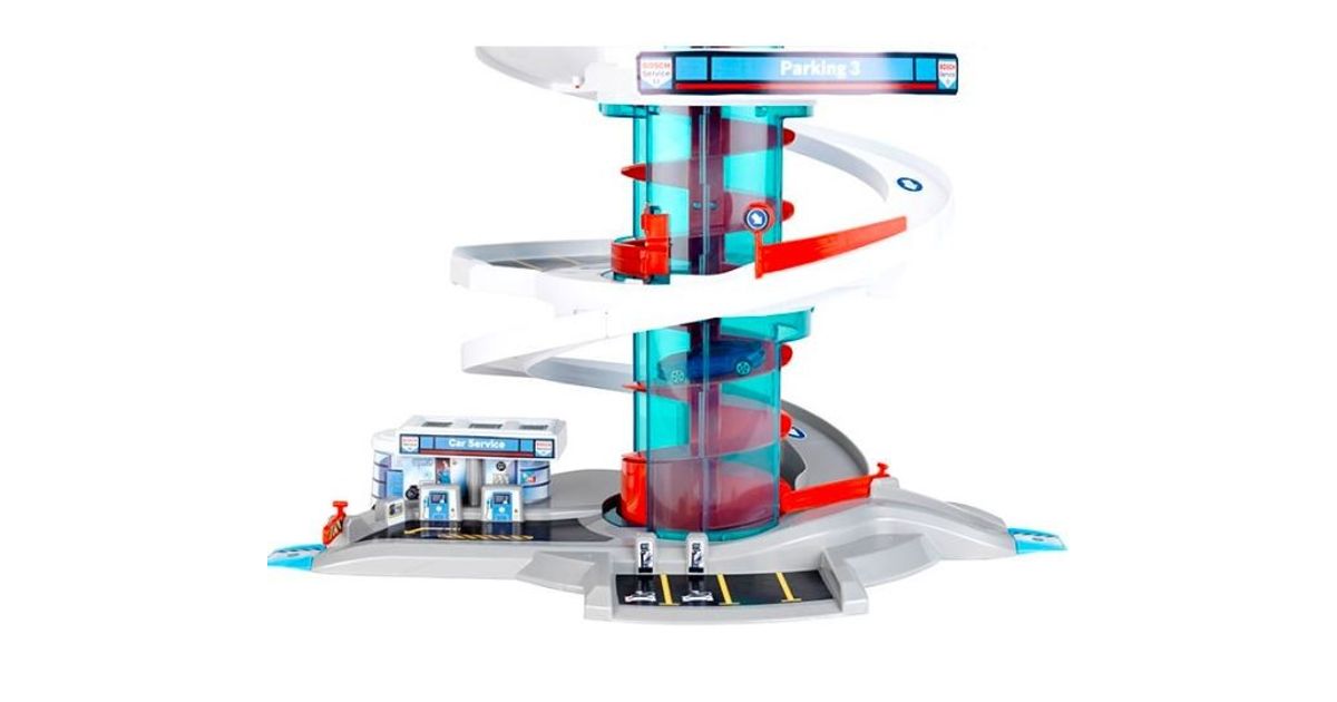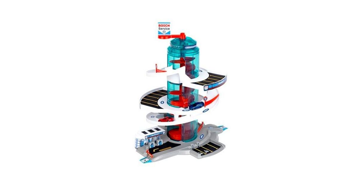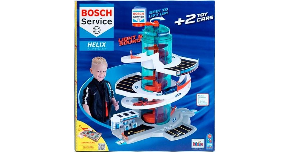 Klein 2899 Garage/Parking "Helix" Garage ''Bosch Car Service Helix'''' with spiral lift that transports cars to the different levels by rotating the spiral - with light and sound effects. The set includes 2 vehicles. Car park with several switches to change direction. Multi-storey car park with ramps and 4 fuel dispensers. The height of the multi-storey car park when assembled is 57 cm. Multi-storey car park in Bosch Car Service design.