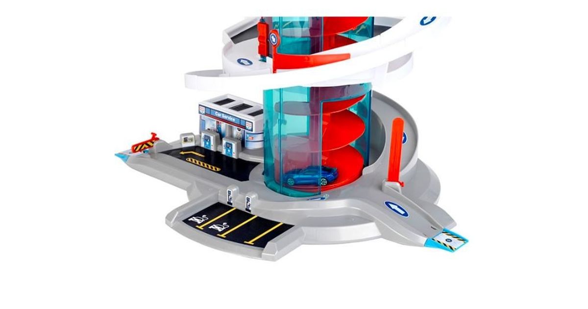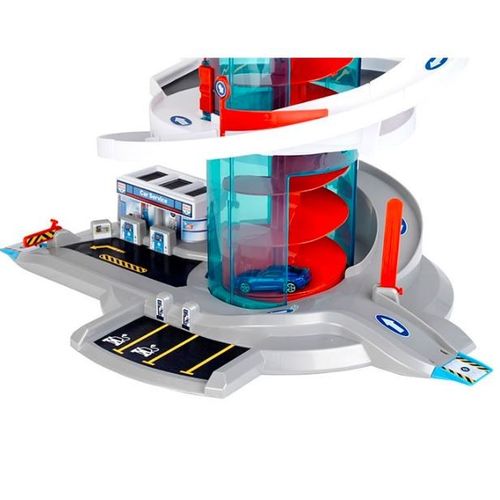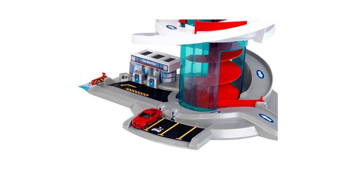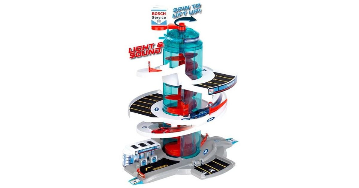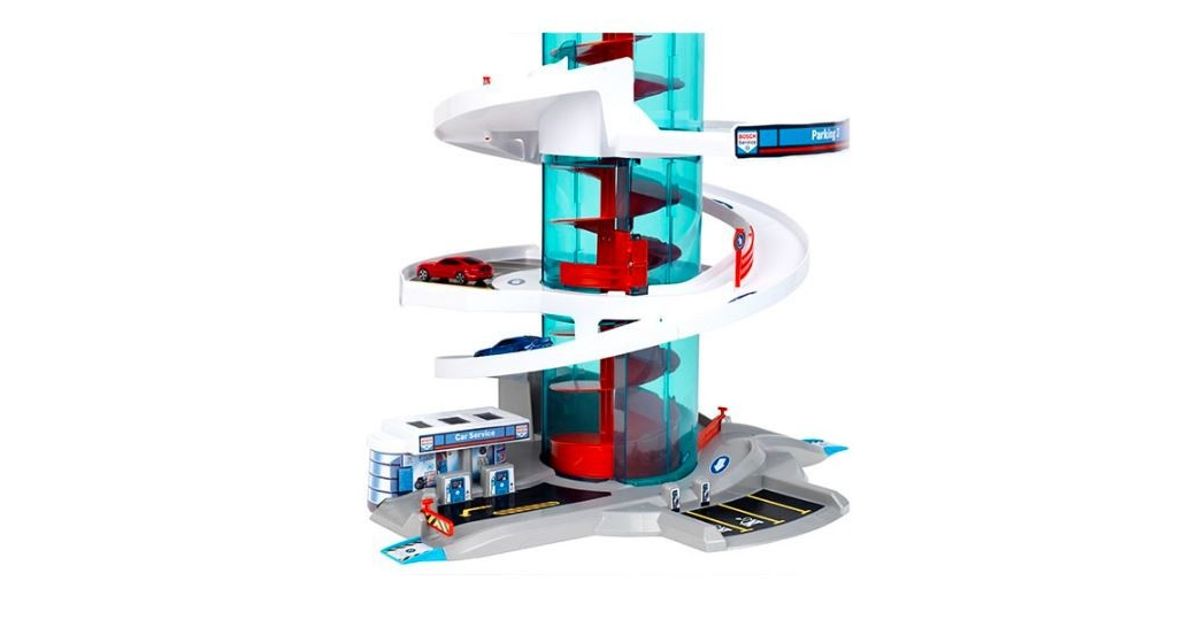 Klein 2899 Garage/Parking "Helix" Garage ''Bosch Car Service Helix'''' with spiral lift that transports cars to the different levels by rotating the spiral - with light and sound effects. The set includes 2 vehicles. Car park with several switches to change direction. Multi-storey car park with ramps and 4 fuel dispensers. The height of the multi-storey car park when assembled is 57 cm. Multi-storey car park in Bosch Car Service design.