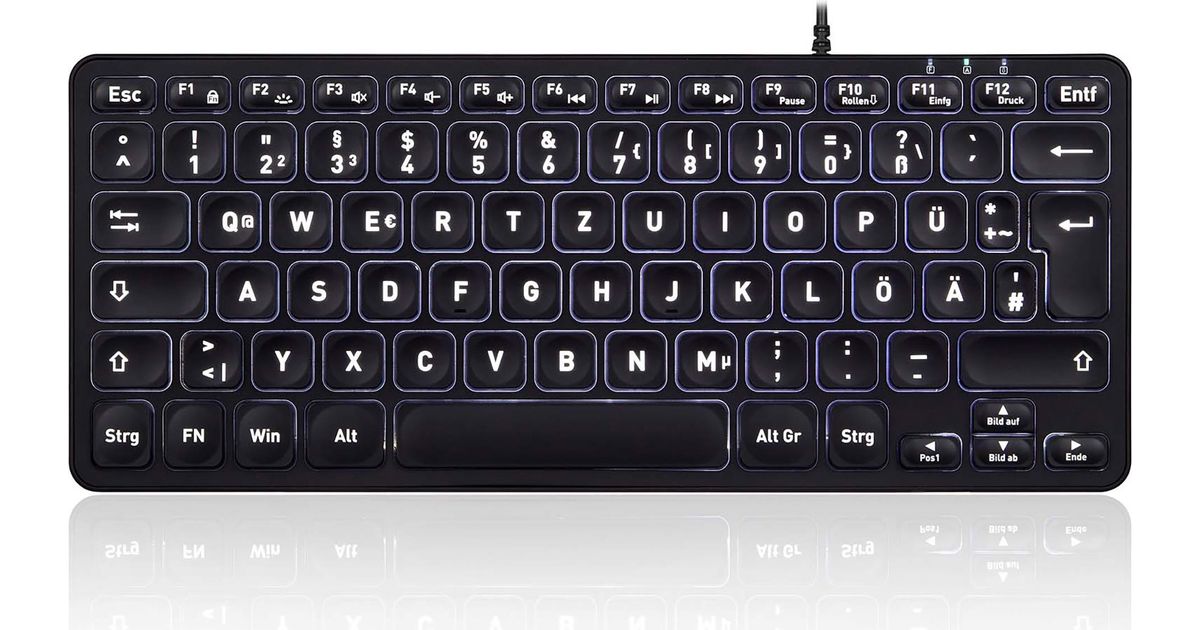 Perixx PERIBOARD-332B. Tastatur Formfaktor: Mini, Geräteschnittstelle: USB, Tastatur-Key Switch: Scherenschlüsselschalter, Tastaturaufbau: QWERTZ. Typ der Hintergrundbeleuchtung: L