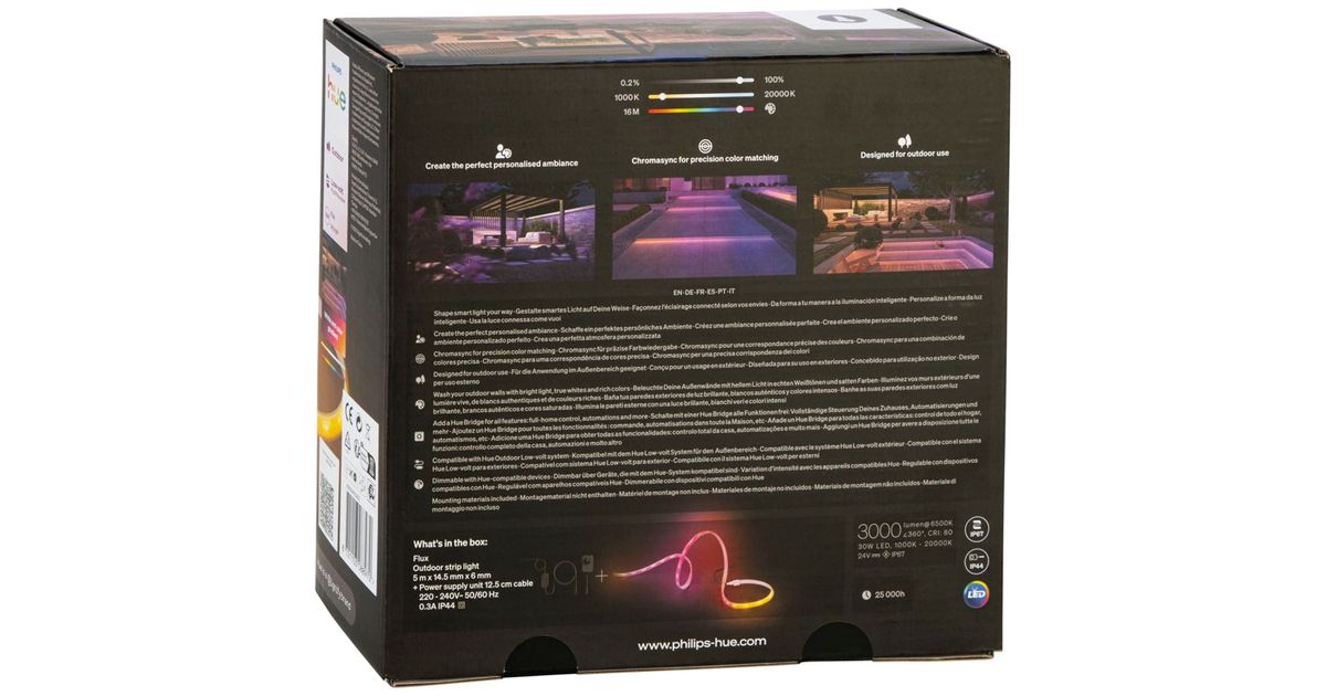 The Flux Lightstrip offers you the opportunity to customize your outdoor areas. With a brightness of 3000 lumens and the ability to produce true white light in various tones, it is perfect for any occasion. Control via app and voice commands makes operation particularly convenient.