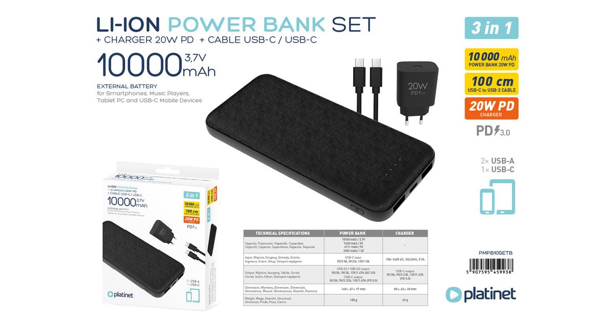 Selles Platinet komplektis on 10 000 mAh mahutavusega akupank, mis laeb keskmise nutiseadme aku mitu korda täis. Laadimiseks on sel kaks standardset USB pesa ning üks USB-C pesa. Lisaks on komplektis 20 W Power Delivery 3.0 kiirlaadimise toega USB-C laadija ja 1-meetrine USB-C - USB-C kaabel.