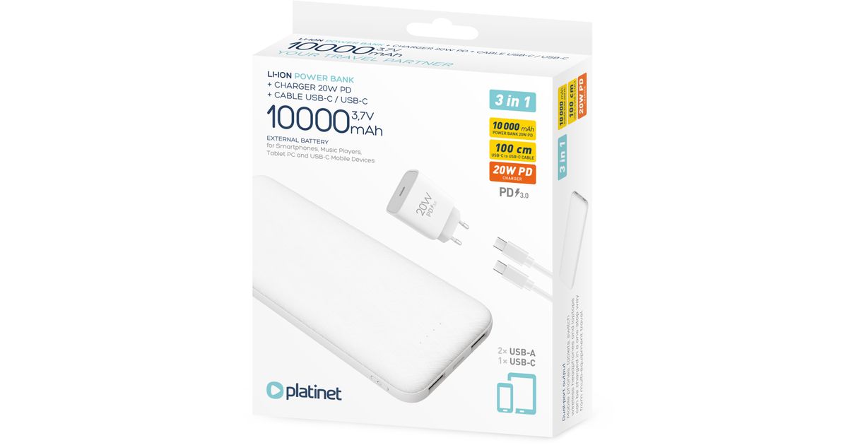 Selles Platinet komplektis on 10 000 mAh mahutavusega akupank, mis laeb keskmise nutiseadme aku mitu korda täis. Laadimiseks on sel kaks standardset USB pesa ning üks USB-C pesa. Lisaks on komplektis 20 W Power Delivery 3.0 kiirlaadimise toega USB-C laadija ja 1-meetrine USB-C - USB-C kaabel.