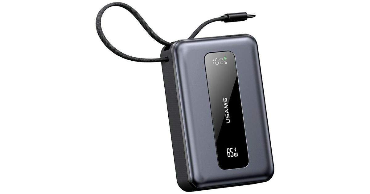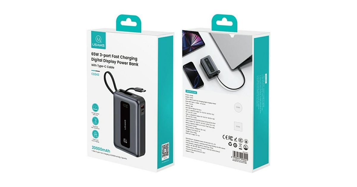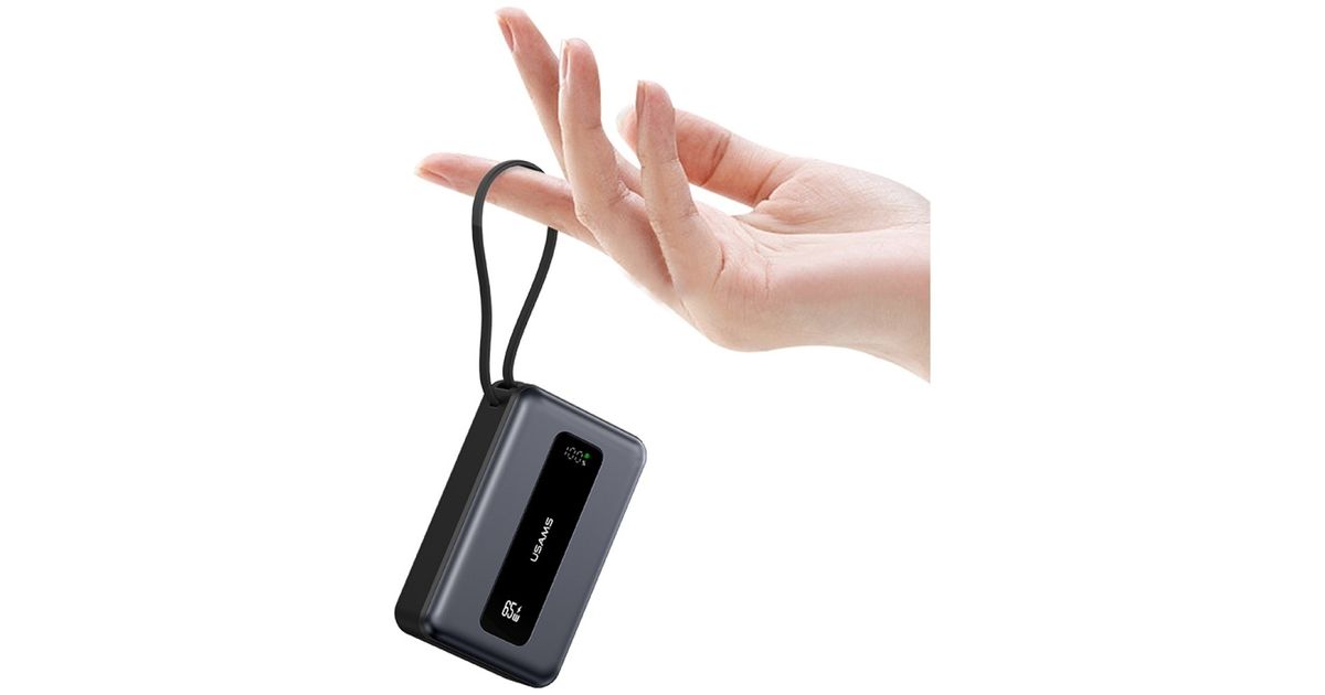 The USAMS CD243 from the XH series is a power bank with an impressive capacity of 20,000mAh , which was designed with the modern user in mind. The compact housing measuring 108×68×32.5 mm conceals the power capable of charging a smartphone even several times, and thanks to the 65W PD3.0 technology , it can also easily power laptops. The built-in USB-C cable means that you don't have to remember about additional accessories, which makes it an exceptionally practical companion for travel, mobile work or everyday use.