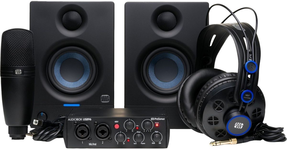 The PreSonus AudioBox 96k Complete Bundle is your one stop shop for self-made audio creators seeking studio-quality sound. Featuring the high fidelity AudioBox 96 USB 2x2 / 24 bit / 96 kHz Audio Interface, pro recording software access with 6 months of Studio One+, a pair of powerful Eris 3.5 Studio Monitors packed with low-end punch, a pair of HD7 ergonomic high-definition headphones, and an M7 MKII professional cardioid condenser microphone, the PreSonus AudioBox 96 USB Complete Bundle gives you everything you need to create like a pro.PreSonus AudioBox 96k USB Audio Interface2x2, 24-bit / 96 kHz USB-C Audio InterfaceTwo combination mic/instrument inputs with high-quality mic preamplifiersLow-noise, high-headroom design with +35 dBu of adjustable gain and switchable +48V phantom power for professional XLR condenser mics¼-inch stereo headphone outputTwo balanced TRS ¼-inch main outputs for studio monitors or other speakersPro DAW Recording Software Access Included6 months of Studio One+ with access to Studio One Pro DAW recording software, add-ons, and more.PreSonus Eris 3.5 Studio Monitors5-inch, woven-composite, low-frequency driver1-inch, ultra-low mass, silk-dome, high-frequency driver50W, Class AB dual amplification80 Hz to 20 kHz frequency response98 dB SPL (Peak, @ 1 meter)High- and low-frequency Acoustic Tuning controlsBalanced, ¼-inch TRS inputs; unbalanced, ⅛-inch stereo and RCA inputs; and integrated stereo headphone amplifier with front-panel ⅛-inch outputProtection: RF interference, output-current limiting, over-temperature, turn-on/off transient, subsonic filterPower Saver mode (engages after 40 minutes)Comes with speaker wire, ⅛-inch TRS to stereo RCA cable, and stereo ⅛-inch TRS to ⅛-inch TRS cablePreSonus M7 MKII MicrophoneVersatile cardioid condenser microphone with mic stand adapter and windscreen.Exceptional clarity throughout its frequency-response range, with a warm top endCardioid polar patternMic stand adapter, 10' XLR cable, and mic pouch included1-inch (25 mm) back electret condenser capsuleRugged constructionPreSonus HD7 Professional Monitoring HeadphonesErgonomic high-definition headphones.High resolution driversPrecision-tuned acoustic chamberExtended bass responseComfortable and long-lasting ear padsLightweight