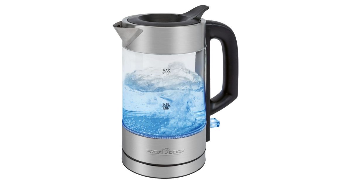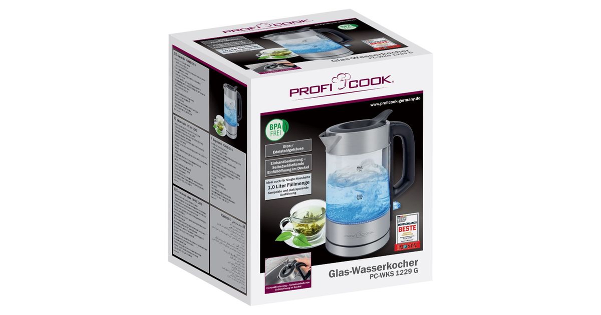 ProfiCook PC-WKS 1229 G, 1 l, 1600 W, Roostevaba teras, Läbipaistev, Klaas, Roostevaba teras, Veetaseme indikaator, Ülekuumenemise kaitse