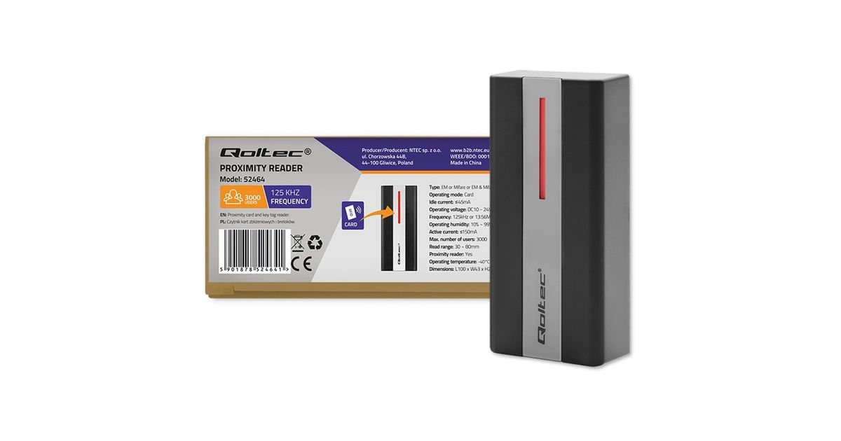 The Qoltec brand proximity reader offers a wide range of capabilities and functions, providing not only security but also convenience. Its ability to program up to 3000 users makes it ideal not only for large corporations, offices or industrial plants, but also for public facilities such as swimming pools, gyms, car parks or libraries. The device has a built-in LED and an audible signal. When the card is read and the user is identified, the LED turns green and the device emits a single beep to confirm successful access. It has a lock mechanism after 10 unsuccessful access attempts in one minute, the reader will automatically lock for a period of 10 minutes.