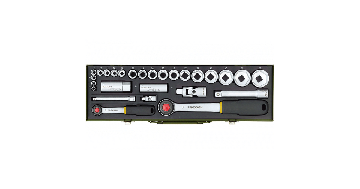 Proxxon 23 020, Padrunvõtmete komplekt, 27 tk, Kroom, Käristi, 2 tk, 1/2, 1/4"