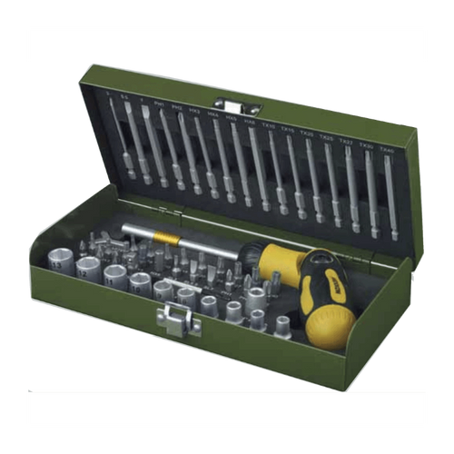 - Komplekt 38 tk 1/4 ″ (6,3 mm) standardpikkusega (25 mm) otsikutega ja 16 tk keermestatud pimeaukude jaoks pikad (80 mm) otsikud