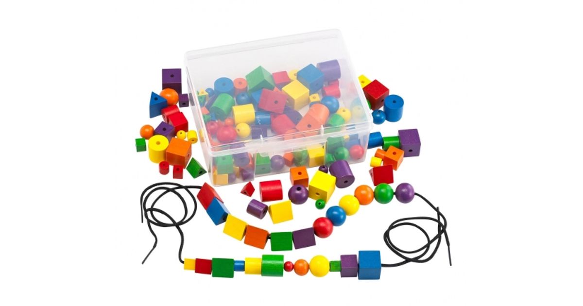 Suur komplekt erikujulise ja eri värvi puust kujundeid. Nende kujundite nööri otsa ajamine treenib silma ja käe koordinatsiooni. Suurima kuubi külje pikkus 2,4 cm, nööri pikkus 55 cm. Plastkarbis.
