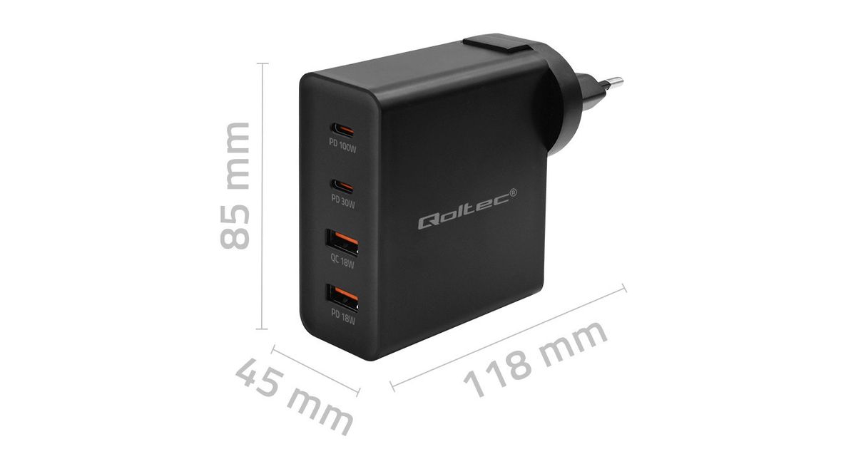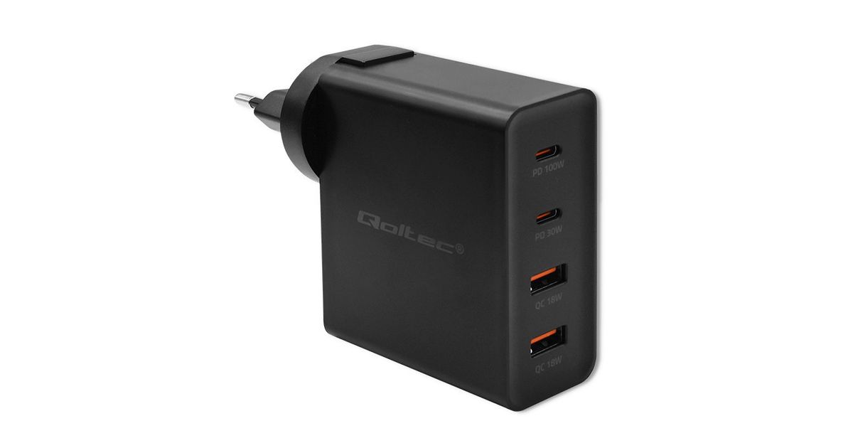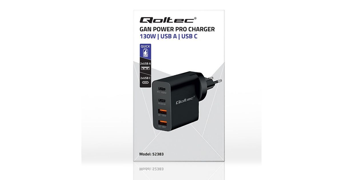 Qoltec laadija GaN Power Pro laadija | 2xUSB-C | 2xUSB | 130W | 5-20V | 1,5-5A| PD | Must