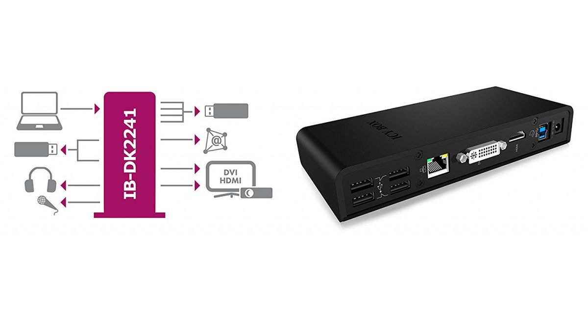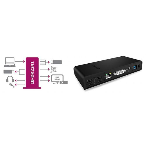 RaidSonic IB-DK2241AC, Juhtmega ühendatud, USB 3.2 Gen 1 (3.1 Gen 1) Type-A, 3,5 mm, 10,100,1000 Mbit/s, Must, 5 Gbit/s