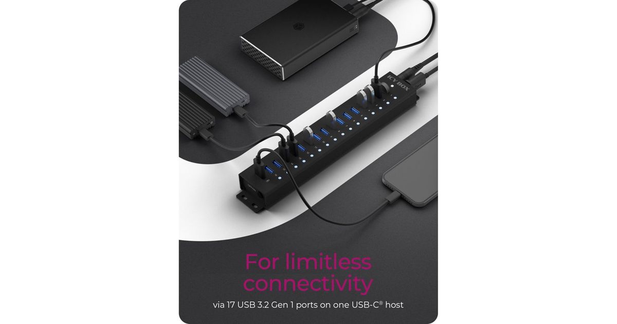 - For unlimited connections: With the docking station, you can expand your PC, tablet or smartphone via a USB Type-C port by 17 powerful USB 3.2 Gen 1 ports and thus access all data simultaneously