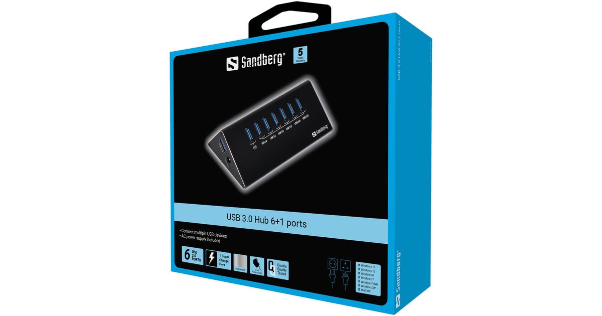 Sandberg USB 3.0 Hub 6+1 ports, USB 3.2 Gen 1 (3.1 Gen 1) Micro-B, USB 3.2 Gen 1 (3.1 Gen 1) Type-A, 5000 Mbit/s, Must, 0,7 m, RoHS compliance