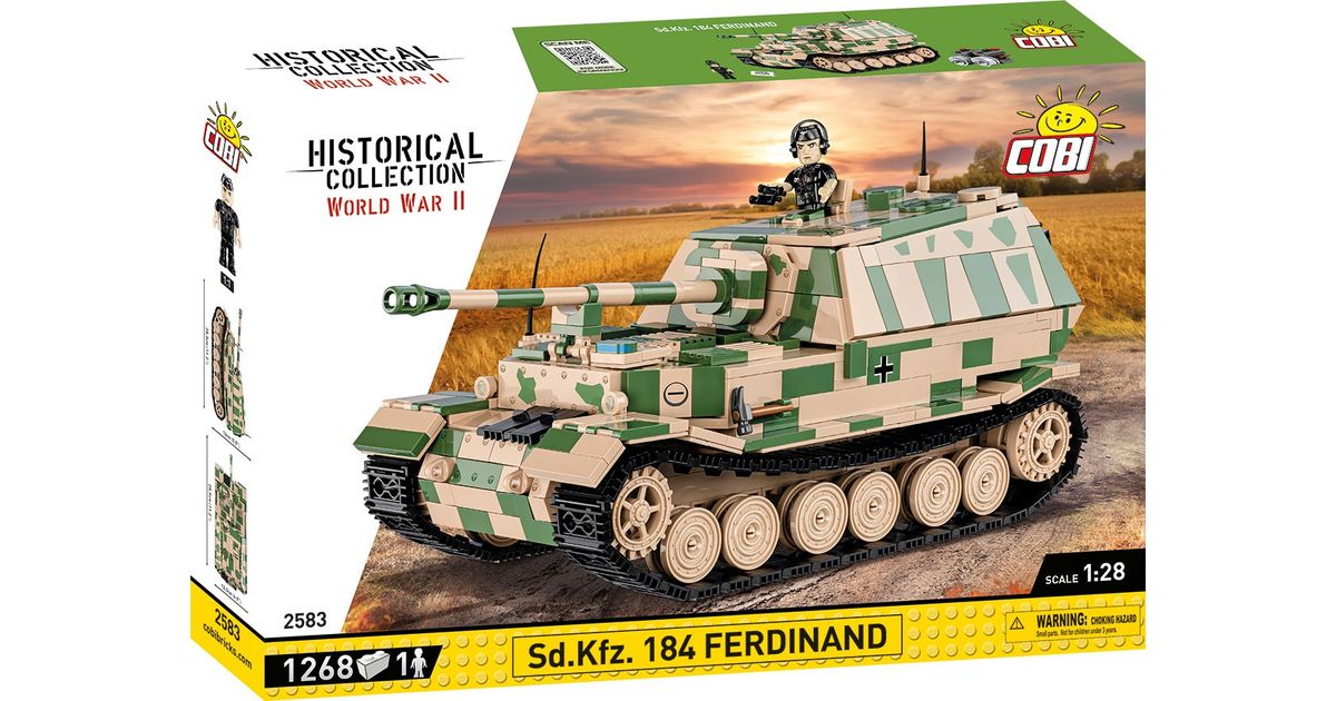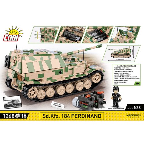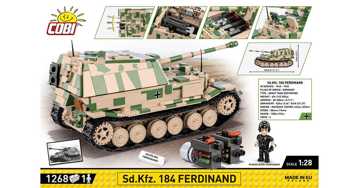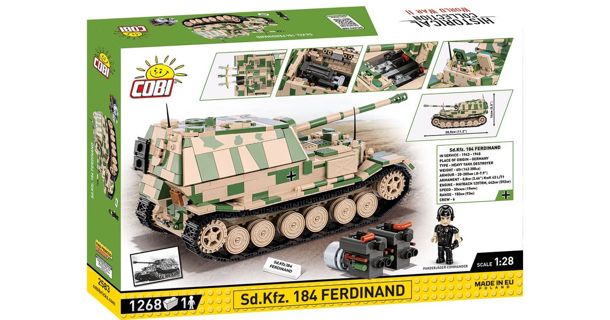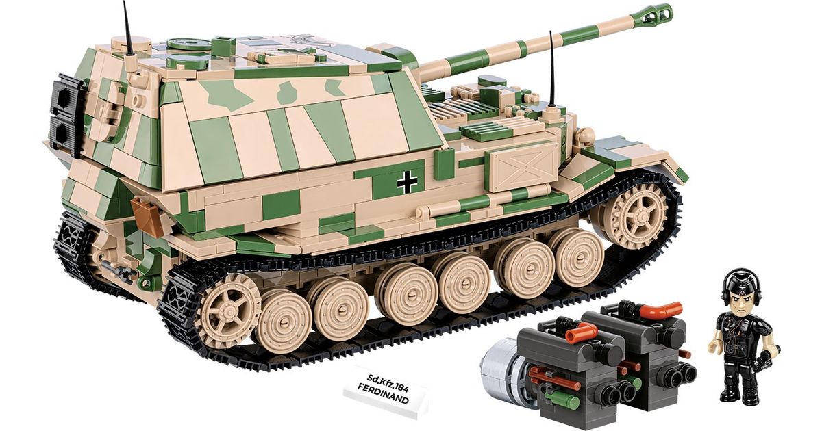 The Panzerjäger Tiger (P) Ferdinand was a German heavy tank destroyer used during World War II. It was constructed on the chassis of the Tiger I tank. Serial production began in 1943. Ferdinands took part in battles on the Eastern Front and during the Battle of Kursk. The tank destroyers were armed with the powerful 88mm PaK 43/2 L/71 anti-tank gun, which made them effective against almost all enemy vehicles. Thick armor also provided good protection for the vehicle. Despite their impressive statistics, Ferdinands also had some drawbacks. These include limited mobility, susceptibility to failures and attacks by enemy infantry. After the Battle of Kursk, many of these vehicles were modernized and used in subsequent phases of the war. The Panzerjäger Tiger (P) Ferdinand was one of the most powerful German vehicles to appear on the battlefield during World War II. However, the role it played in the war was limited due to the small production of this model. Despite this, the vehicle still ignites the imagination of history and military technology enthusiasts. It is also one of the most recognizable vehicles from the Second World War. Build history, piece by piece, with COBI!