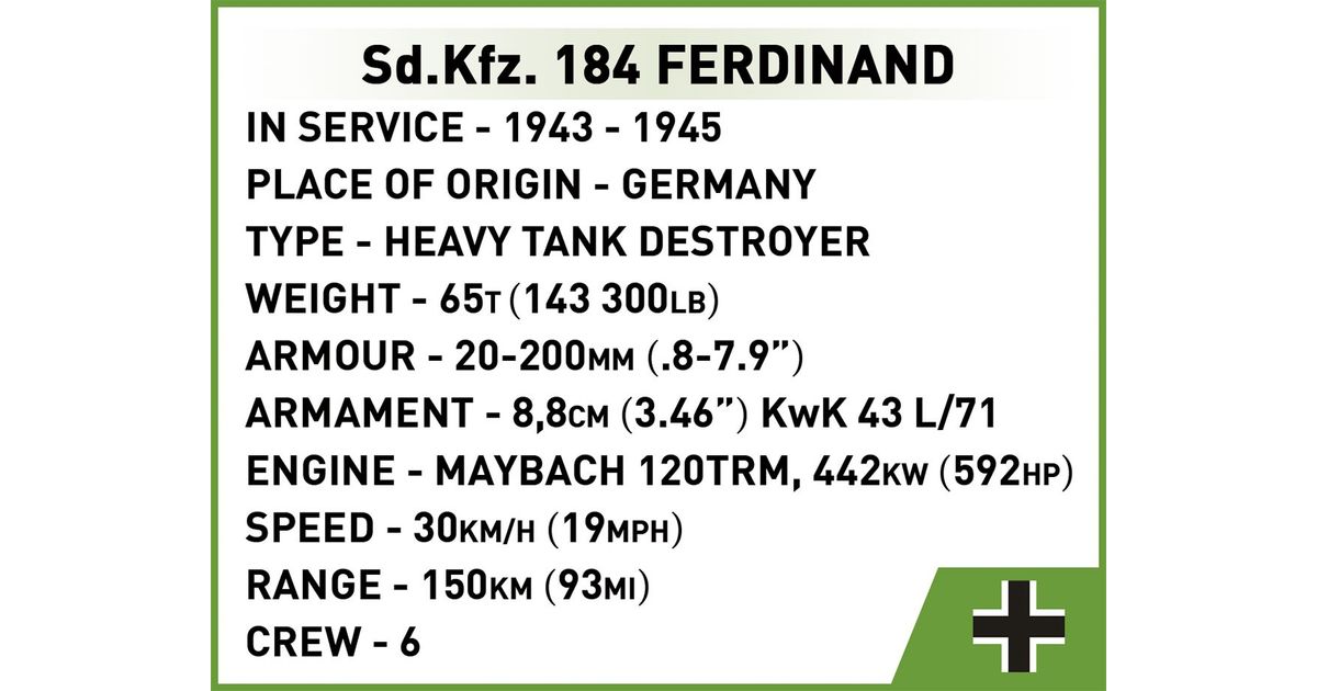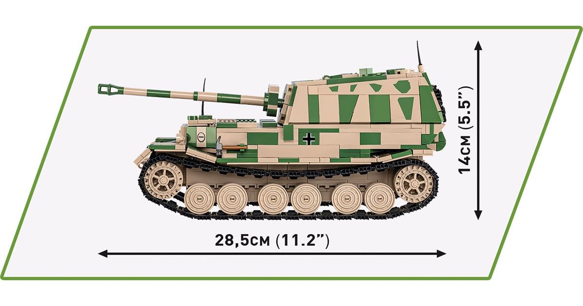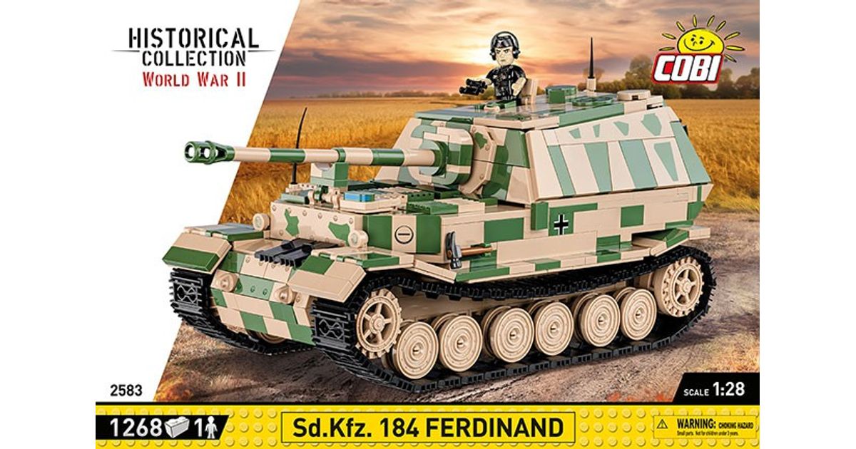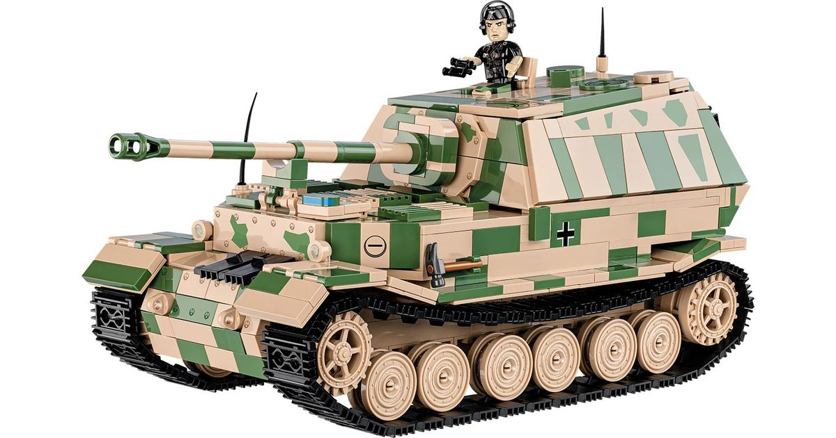The Panzerjäger Tiger (P) Ferdinand was a German heavy tank destroyer used during World War II. It was constructed on the chassis of the Tiger I tank. Serial production began in 1943. Ferdinands took part in battles on the Eastern Front and during the Battle of Kursk. The tank destroyers were armed with the powerful 88mm PaK 43/2 L/71 anti-tank gun, which made them effective against almost all enemy vehicles. Thick armor also provided good protection for the vehicle. Despite their impressive statistics, Ferdinands also had some drawbacks. These include limited mobility, susceptibility to failures and attacks by enemy infantry. After the Battle of Kursk, many of these vehicles were modernized and used in subsequent phases of the war. The Panzerjäger Tiger (P) Ferdinand was one of the most powerful German vehicles to appear on the battlefield during World War II. However, the role it played in the war was limited due to the small production of this model. Despite this, the vehicle still ignites the imagination of history and military technology enthusiasts. It is also one of the most recognizable vehicles from the Second World War. Build history, piece by piece, with COBI!