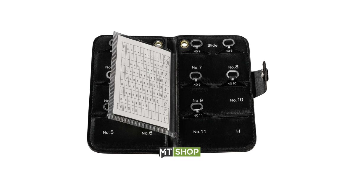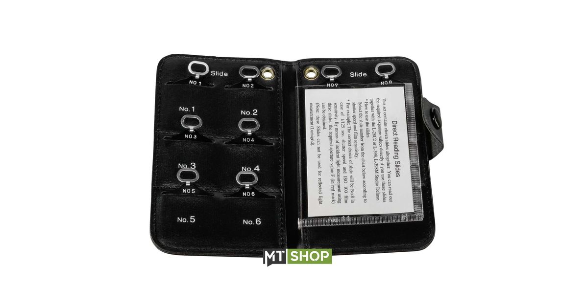 This accessory enables you to read aperture directly. Select the slide according to the combination of ISO sensitivity and shutter Speed, and insert it to the head of L-398A to read directly the aperture value indicated by the needle.