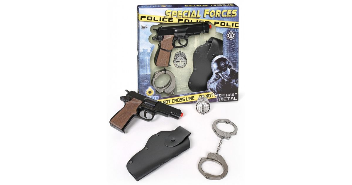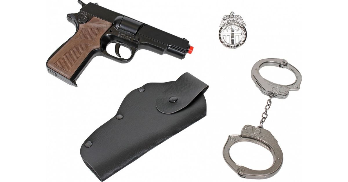 Set includes: metal handcuffs, metal 8-round pistol, holster.