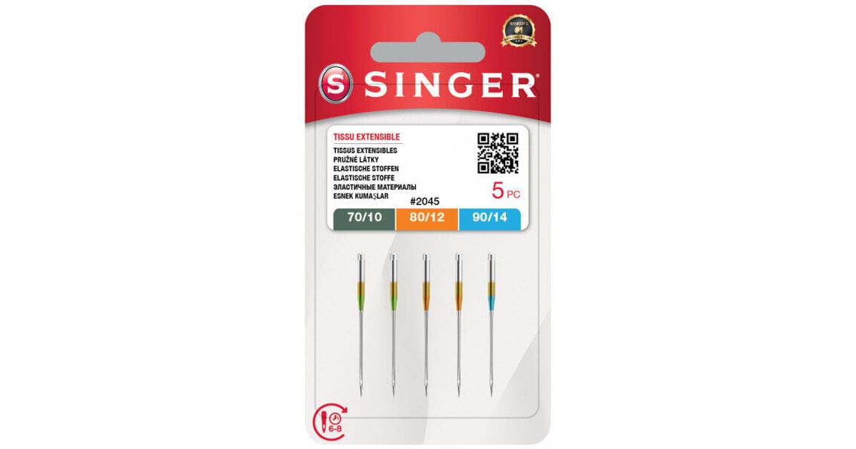 Stretch needles for Singer home sewing machines, strength 2x70 / 10, 2x80 / 12, 1x90 / 14Stretch needles with a spherical tip have a rounder tip, which prevents the mesh from flowing and tearing the knit fibers as it passes between the fibers.Singer needles for sewing machines have a color marking of the needle type on the shaft:Metallic (for metallic threads - without color marking), Quilting (for quilting - purple marking), Universal (universal for all fabrics - red marking), Overlock 14SH (for overlocks - without color marking), Microtex (for microfiber, silk - black marking), Jeans (for denim - blue marking), Leather (for leather and imitation leather - brown marking), Hemstitch (for hemming - without color marking), Embroidery (for embroidery machines - white marking), Stretch (for knitwear - yellow marking) , Overlock 14U (for overlocks - unmarked).Furthermore, the needles are marked in color, according to the strength of the needle (needle size). The designation 100 corresponds to a needle width of 1 mm. The designations are as follows:60/08 (without color marking), 70/09 (green marking), 80/12 (orange marking), 90/14 (blue marking), 100/16 (purple marking), 110/18 (yellow marking), 130 / 21 (red marking).We choose the needle strength with regard to the type of material. The thread must always pass easily through the needle, it must not jam.- Light and thin materials require thin needles, then we choose thin threads- Thick materials require thicker needles, then we can choose thicker threadsSinger recommends changing the needle after 6 - 8 hours of sewing (sewing hours), this time is recommended and depends on the type of fabric.