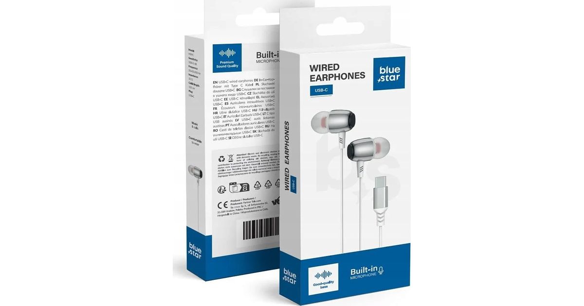 Sinise tähega juhtmega kõrvaklapid, tüüpi C M09C mikrofoniga 1,2 m valge