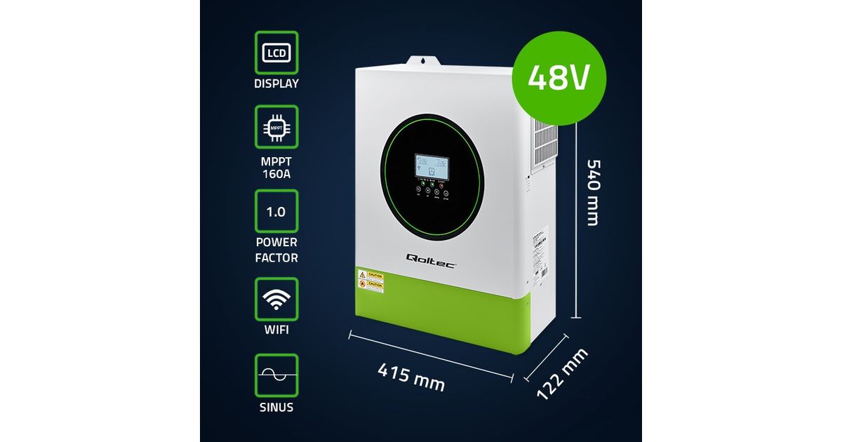 The battery charging inverter uses a state-of-the-art 160A MPPT charge controller to maximize the power drawn from the photovoltaic panels, using advanced maximum power point tracking technology. Having this feature significantly affects the efficiency of the photovoltaic installation-they can maintain high power even in low sunlight conditions. In addition, the controller controls the battery operation and charging process and protects the battery from damage.
