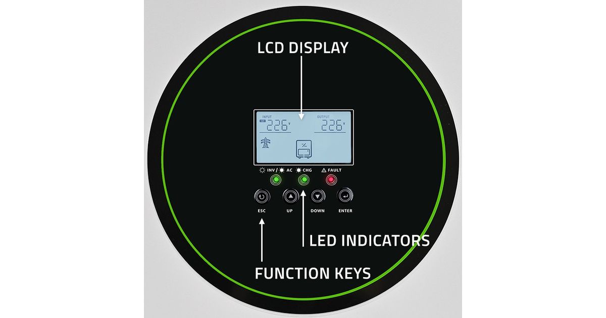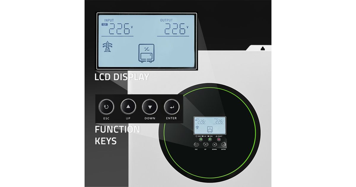The product is equipped with a multifunctional, easy-to-use LCD display with control panel. Facilitates monitoring of the entire photovoltaic installation. Allows you to configure the input voltage range for home appliances and personal computers or change the priority settings of the AC/Solar charger. In addition, the display records data and informs about failures, reacting accordingly if any of the parameters exceed the norm. If a fault occurs, the inverter shuts down.