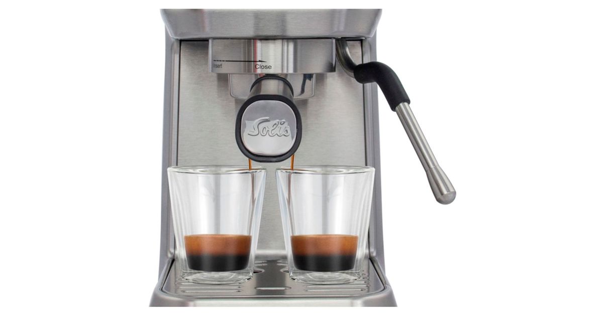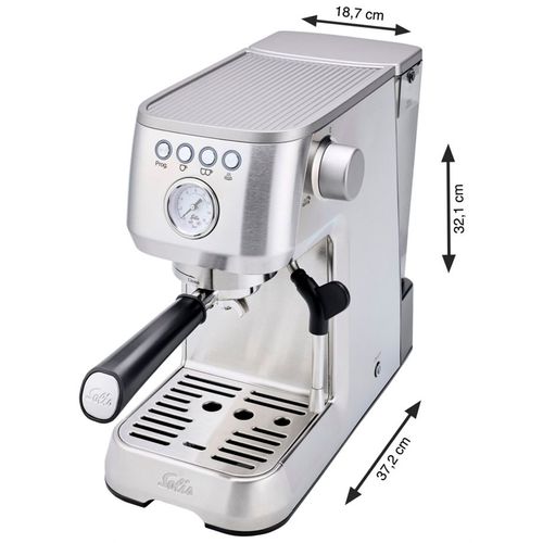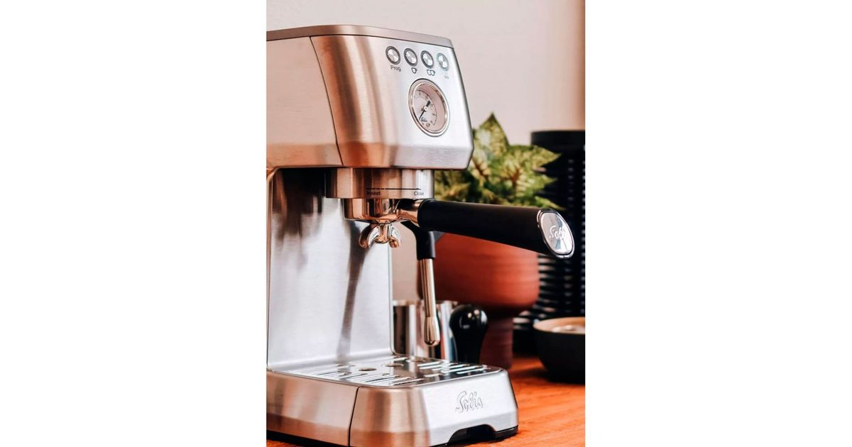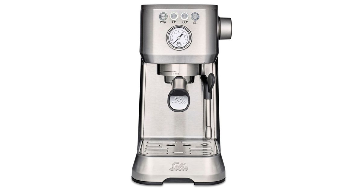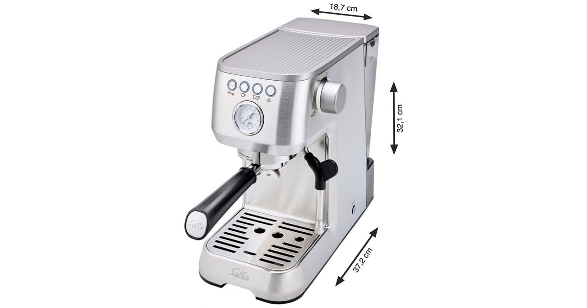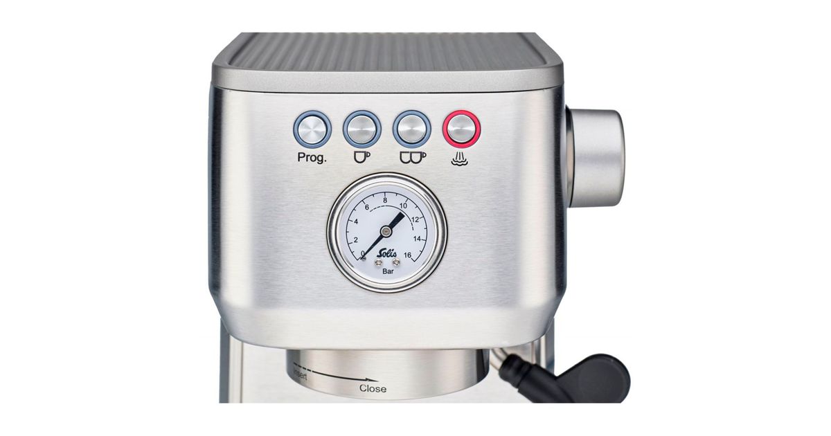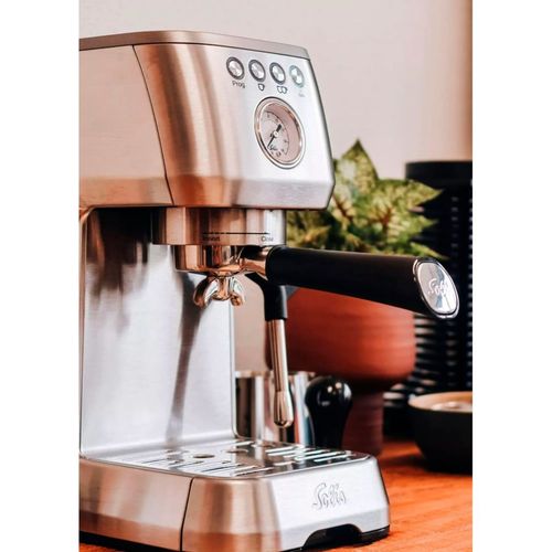 The Barista Perfetta Plus from Solis is a portafilter coffee machine that delivers perfect espresso at the touch of a button. With a thermoblock heating system, the machine is ready for use in just 40 seconds. The PID control system keeps the brewing temperature constant.