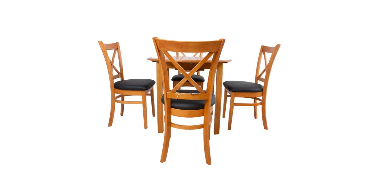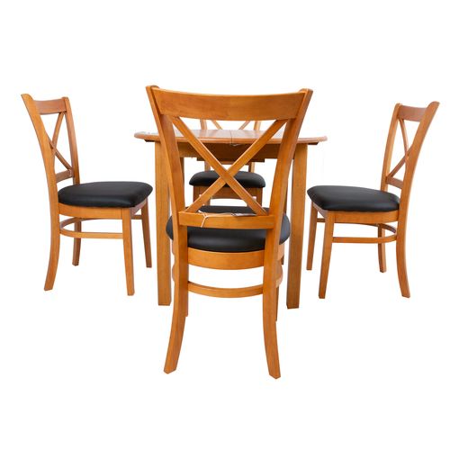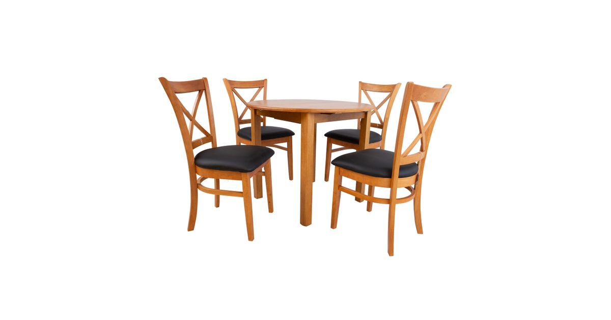 Pikendatav söögilaud MIX & MATCH D90+30xH74cm. Laud on valmistatud kummipuust ja viimistletud heleda tammetoonis lakiga. Lauaplaat avaneb keskelt ja pikendus asetatakse kahe poole vahele. 30cm laiune kokku klapitav vaheplaat on paigutatud lauaplaadi alla. Tool MIX &MATCH 43x43xH90,5cm. Musta kunstnahaga kaetud polsterdatud iste. Kummipuust jalad ja raam on viimistletud heleda tammetoonis lakiga. Kaalupiirang 100kg.