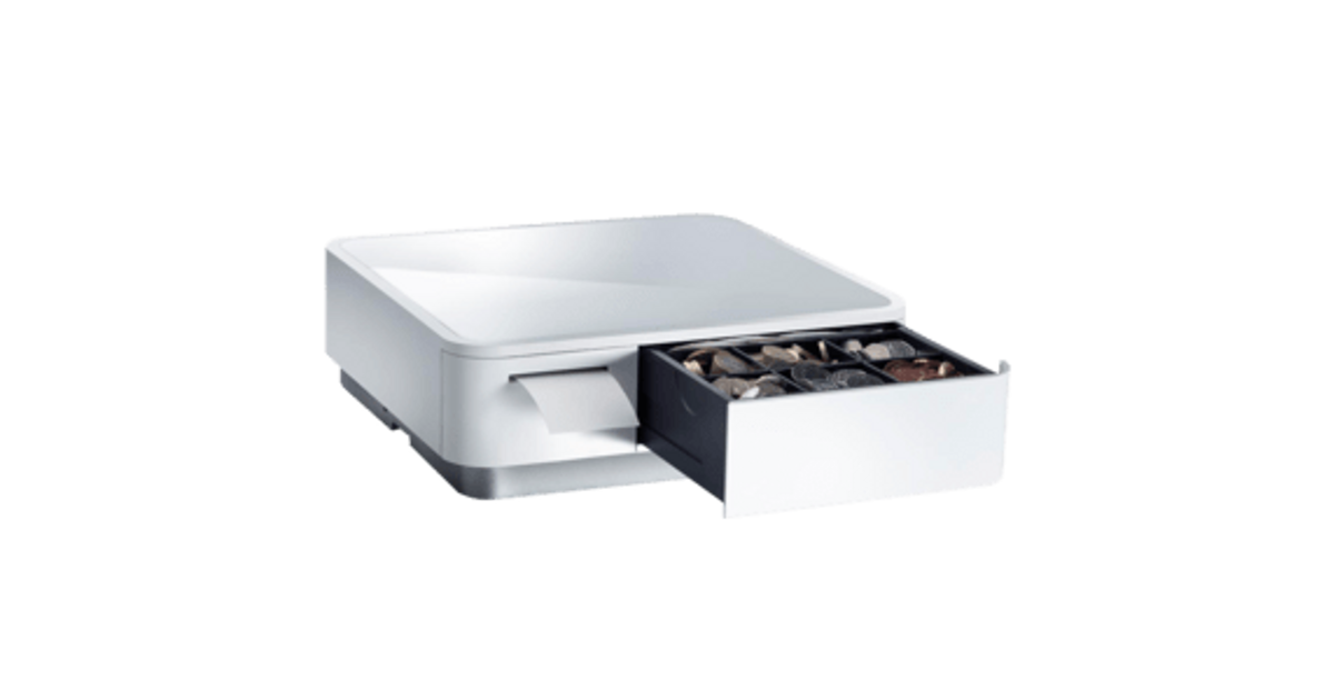 Cash drawer-receipt printer combination, front opening, dimensions (WxHxD): 308x100x300mm, insert: 4 bill, 6/8 coin, 1 check, printer: direct thermal, media width (max): 58mm, roll diameter (max): 50mm, printing speed (max): 100mm/sec, interfaces: 3x USB-A, 1x USB-C (for iOS), 1x USB-B, Bluetooth (5.0), includes: Power cable (EU, UK), USB cable (USB-A/USB-B, white), tablet holder (double-sided), receipt roll, color: white