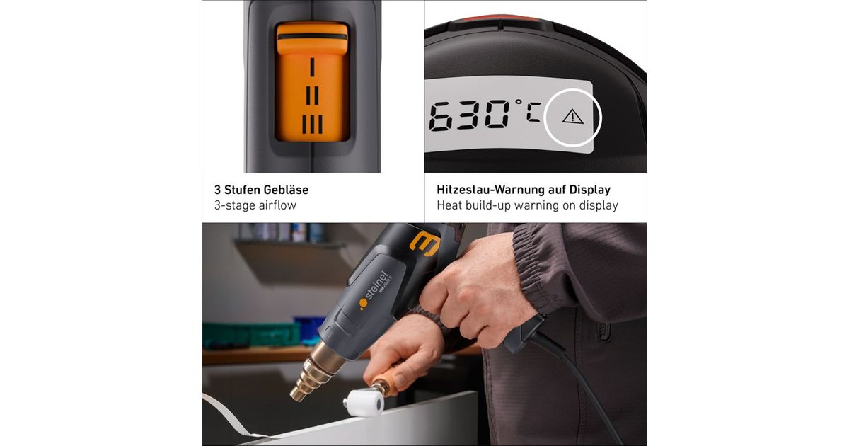 The HeatMatic 2020 E is electronically controlled and perfect for ambitious projects and can be adjusted with 2000 W from 80 to 630°C via display.