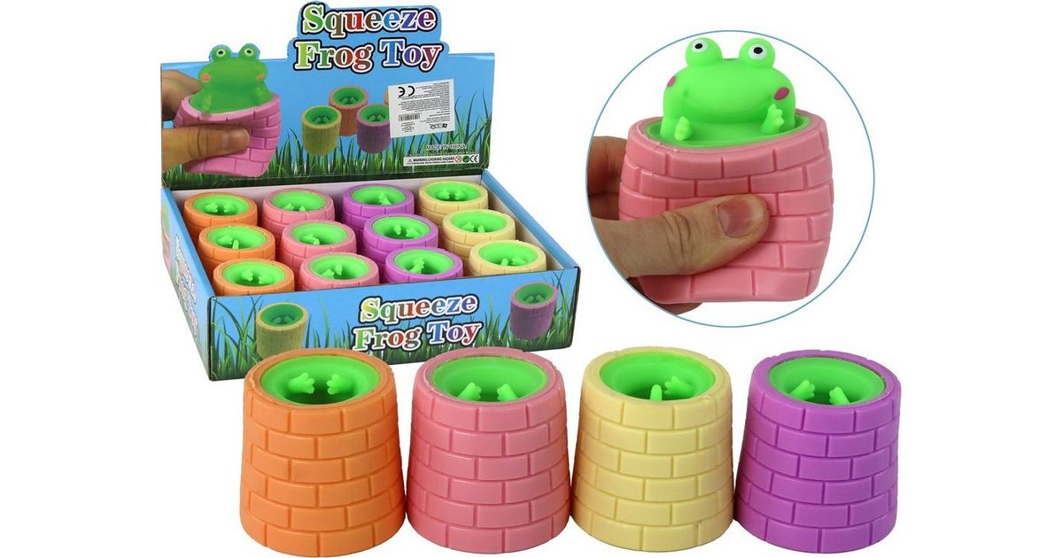 Stressivastane mänguasi. Roheline konn hüppab tünnist välja