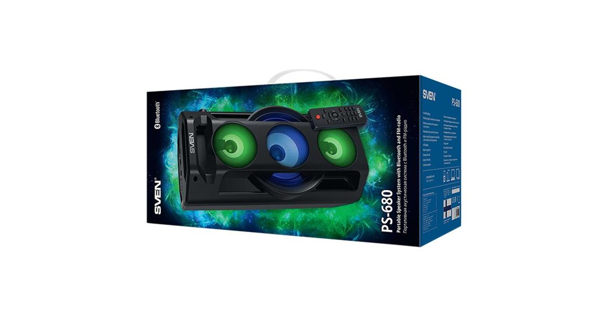 SVEN PS-680 2x32.5W; LED display; TWS; FM radio; AUX; USB/SD-card support;Lighting; Microphone input (karaoke); Remote Control; Built-in equalizer