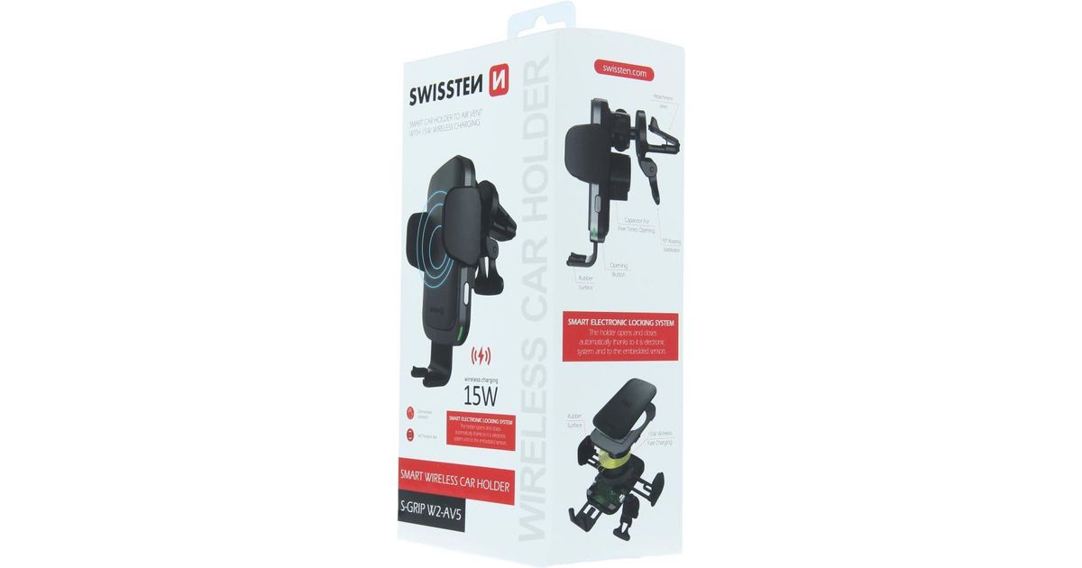 Swissten Car Holder with Wireless Charger 15W, S-Grip W2-AV5, with USB/USB-C Cable, black, Blister (65010606)