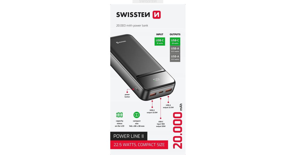Swissten, PowerBank, Power Line II, Li-Pol, 5/9/12 V, telefoni- ja muudele seadmetele, 22013947, 20 000 mAH, must - Akupangad - Akud, patareid ja laadijad - Audio-video - MT Shop